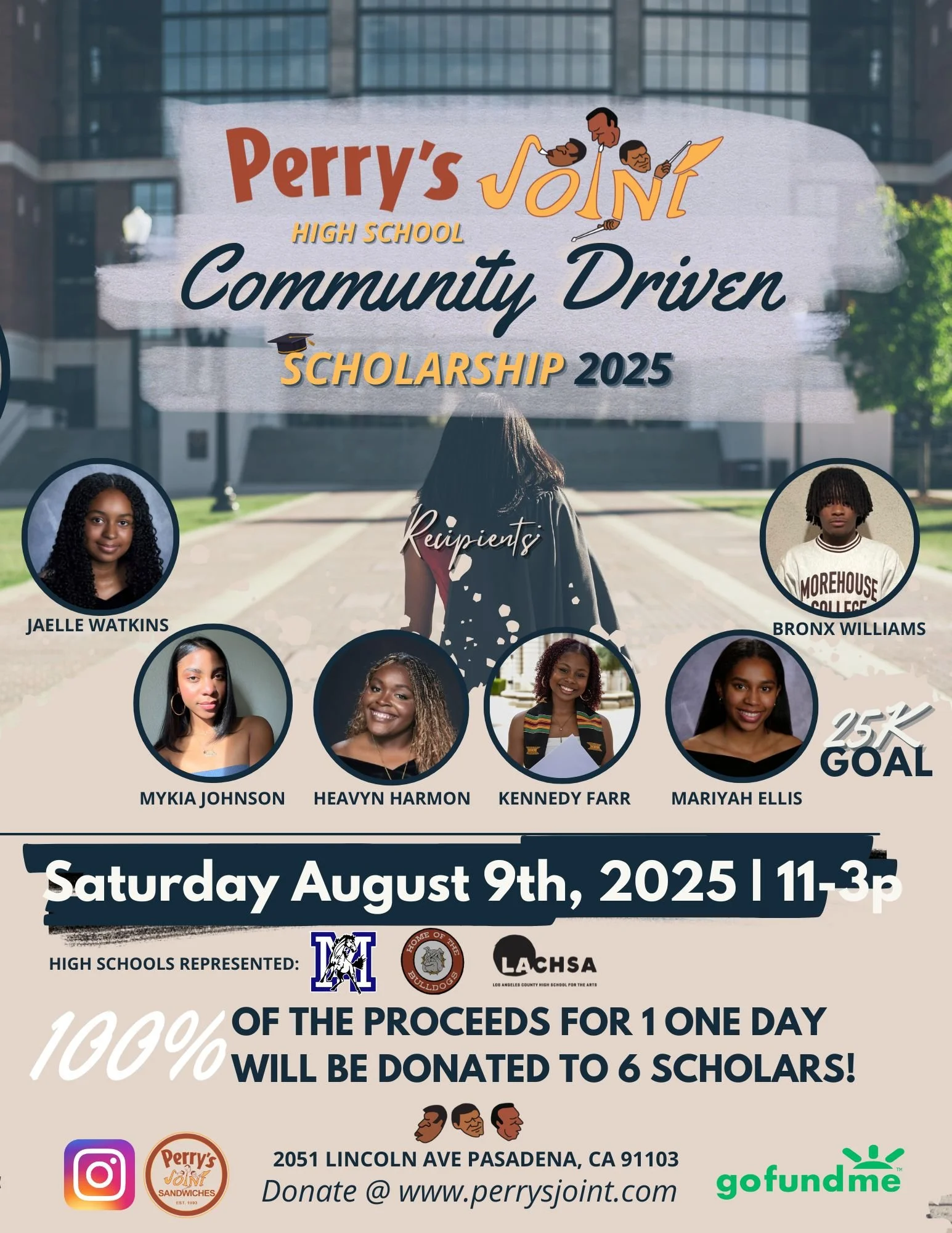 Perry, owner of "Perrys Joint Sandwiches," believes he must give back to the community he’s a part of. Therefore, one day out of the year, Perry conducts a full day of business where 100% of the proceeds earned will serve as a collegiate scholarship to several graduates from John Muir High School, located just 30 seconds south of his shop. This year The Community Driven Scholarship will take place on Saturday, August 9, 2025, @ Perry's Joint on Lincoln Ave. in Pasadena, Ca. But like last year, Perry is extending the scholarship to GoFundMe to give everyone a chance to donate from the comfort of their home.